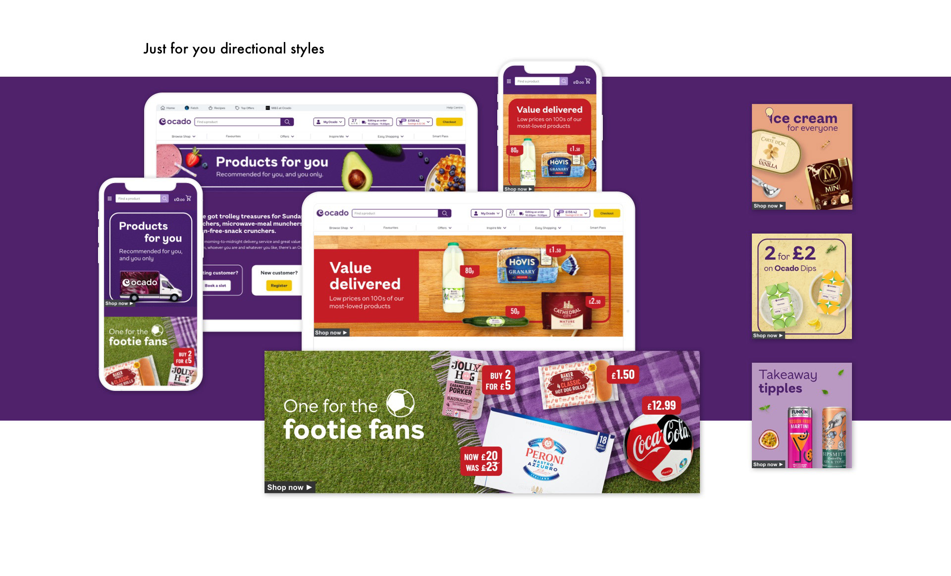 Various projects were delivered for Ocado with the new 'Just For You' branding, including digital concepts and assets for website, email, social and internal communications.